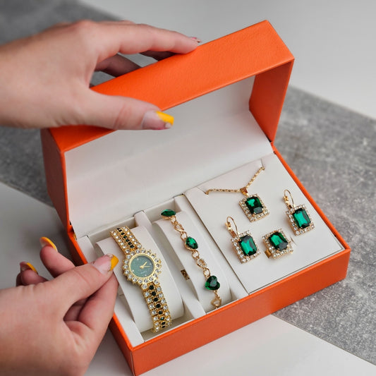 Ensemble de luxe avec montre, bracelet, collier, bague et boucles d’oreilles.